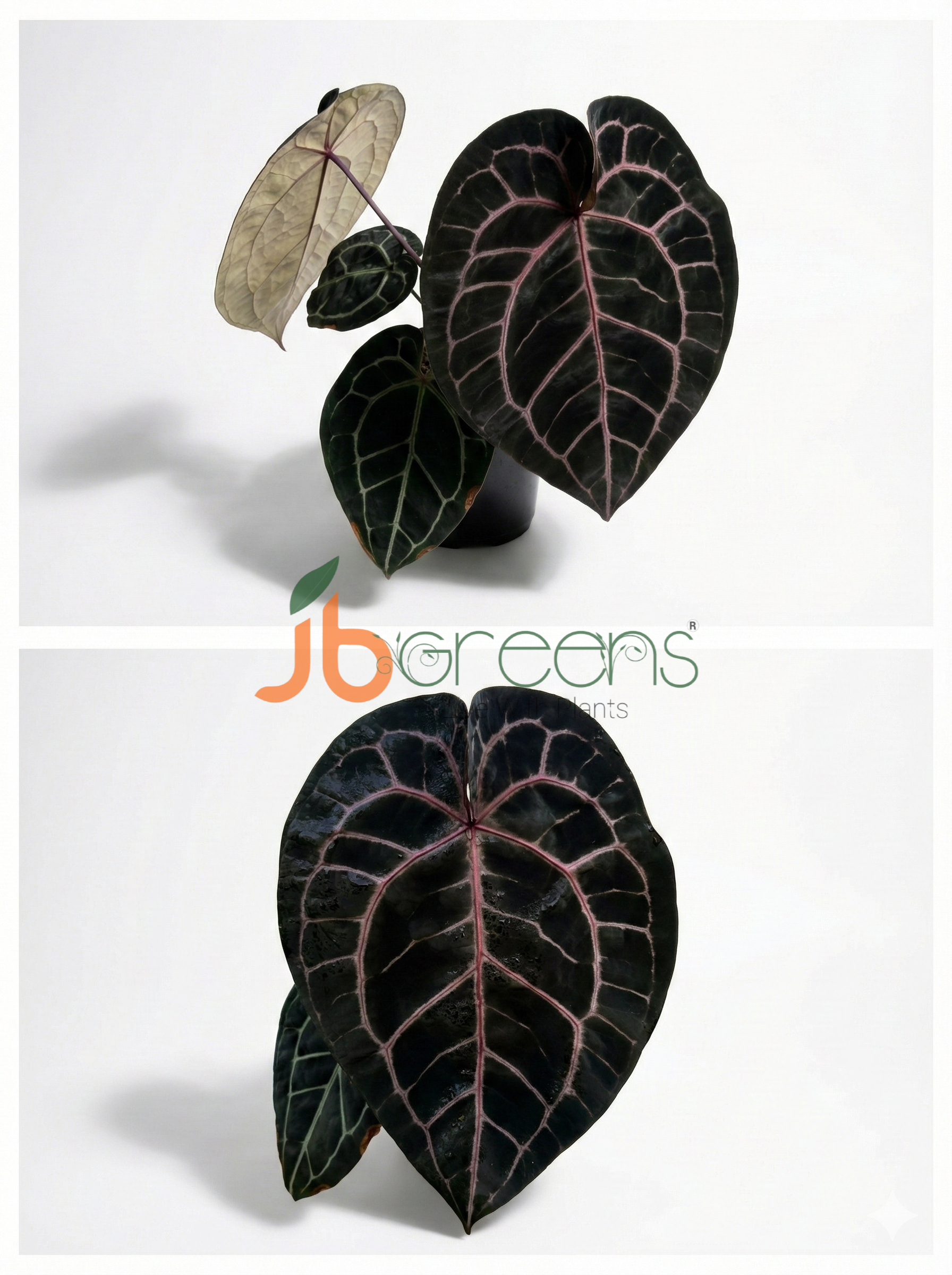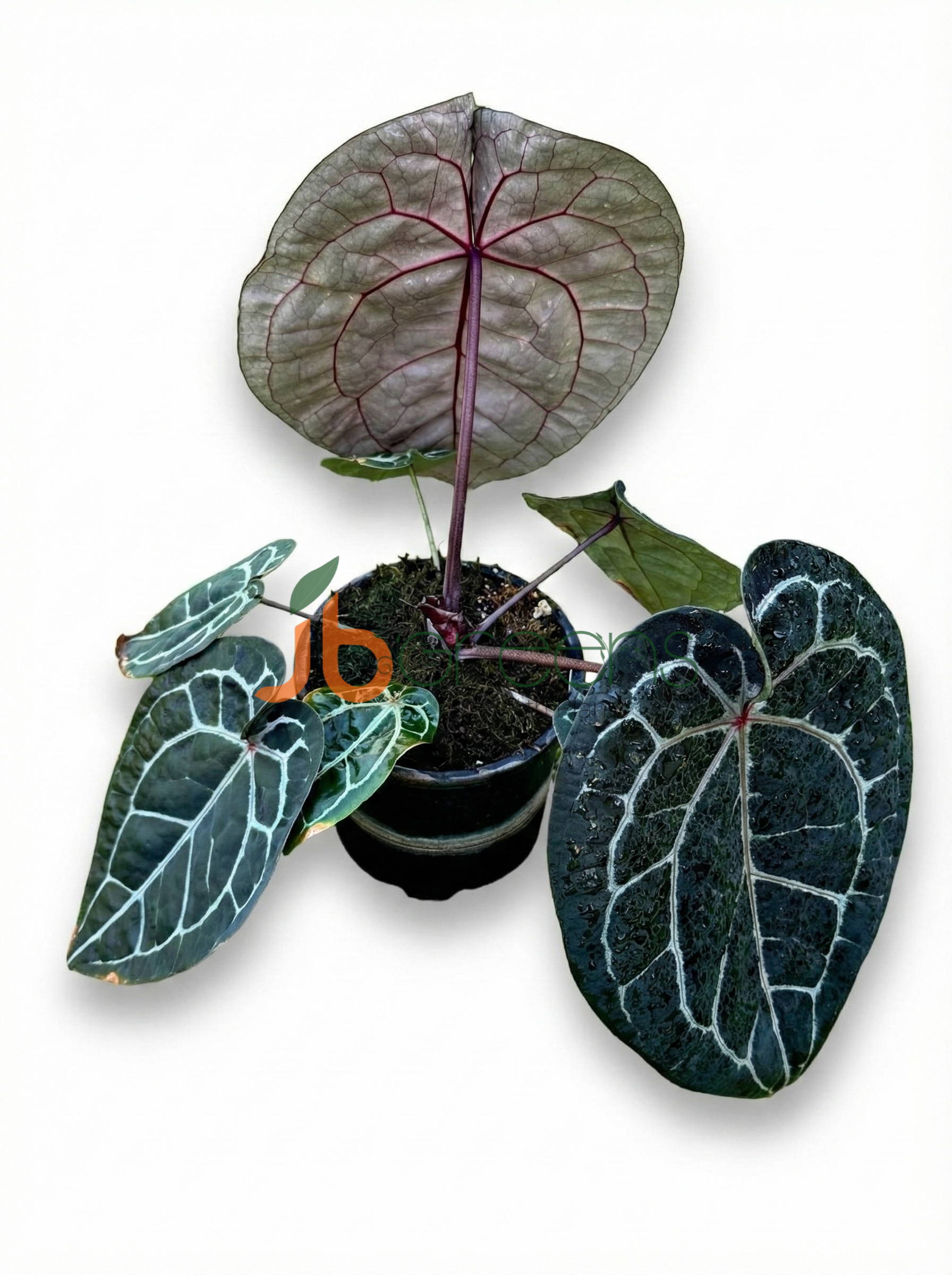 Anthurium Michelle is a rare and highly prized hybrid derived from Anthurium magnificum, originally developed by Dr. Jeff Block. It is celebrated for its striking, heart-shaped velvet leaves which emerge in intense burgundy or violet hues with lighter veins, then transition through shades of bronze and near-black to a mature deep green with crisp white veins. The undersides of the leaves also change color from purple to lavender and eventually light green with darker veins. The petioles and spadix are violet-tinted, adding to its visual appeal. It grows upright with a semi-self-heading habit and can reach about 60–90 cm indoors with a spread up to 60 cm.